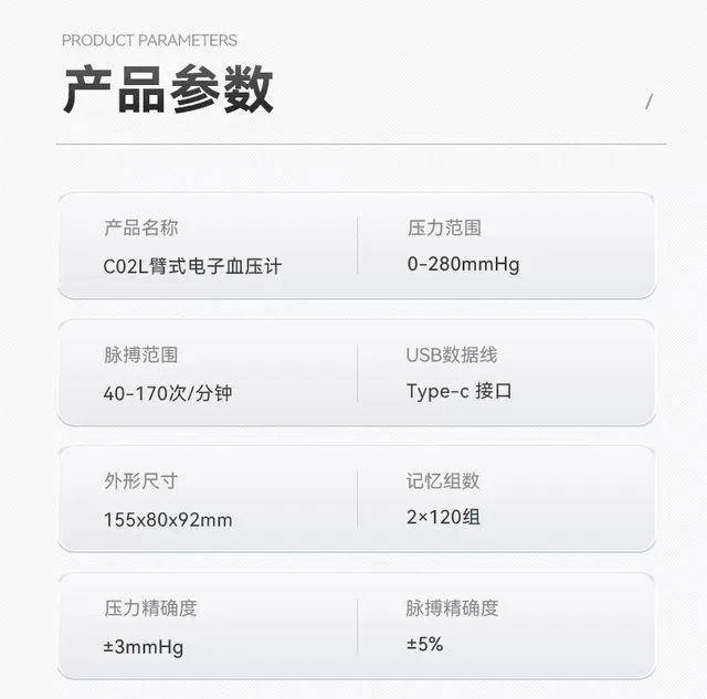 【配件】电子血压计(带收纳盒)*1+360°臂带及空气管*1+充电线*1+包装盒*1+使用说明书及保修卡