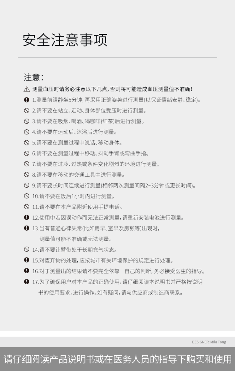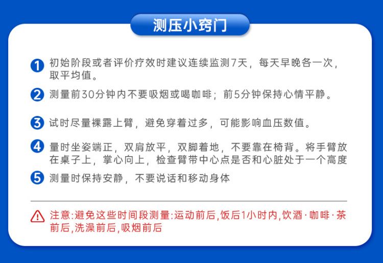 【温馨提示】1、影响血压因素有很多,不同血压计之间存在误差属于正常现象。初始阶段或者评价疗效时建议连续监测7天,每天早晚各一次,取平均值。